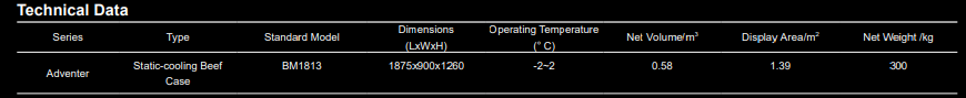 Energy-efficient, static-cooling design,reducing meat dry consumptionFine appearance, all stainless steel designLarger displaying area to highlight goods